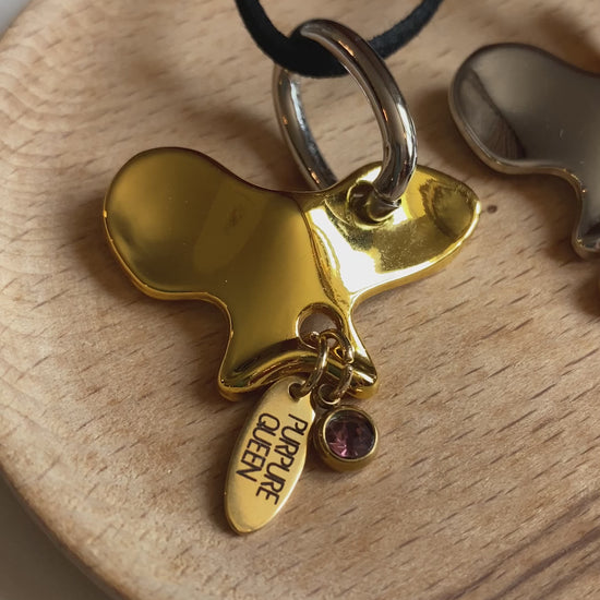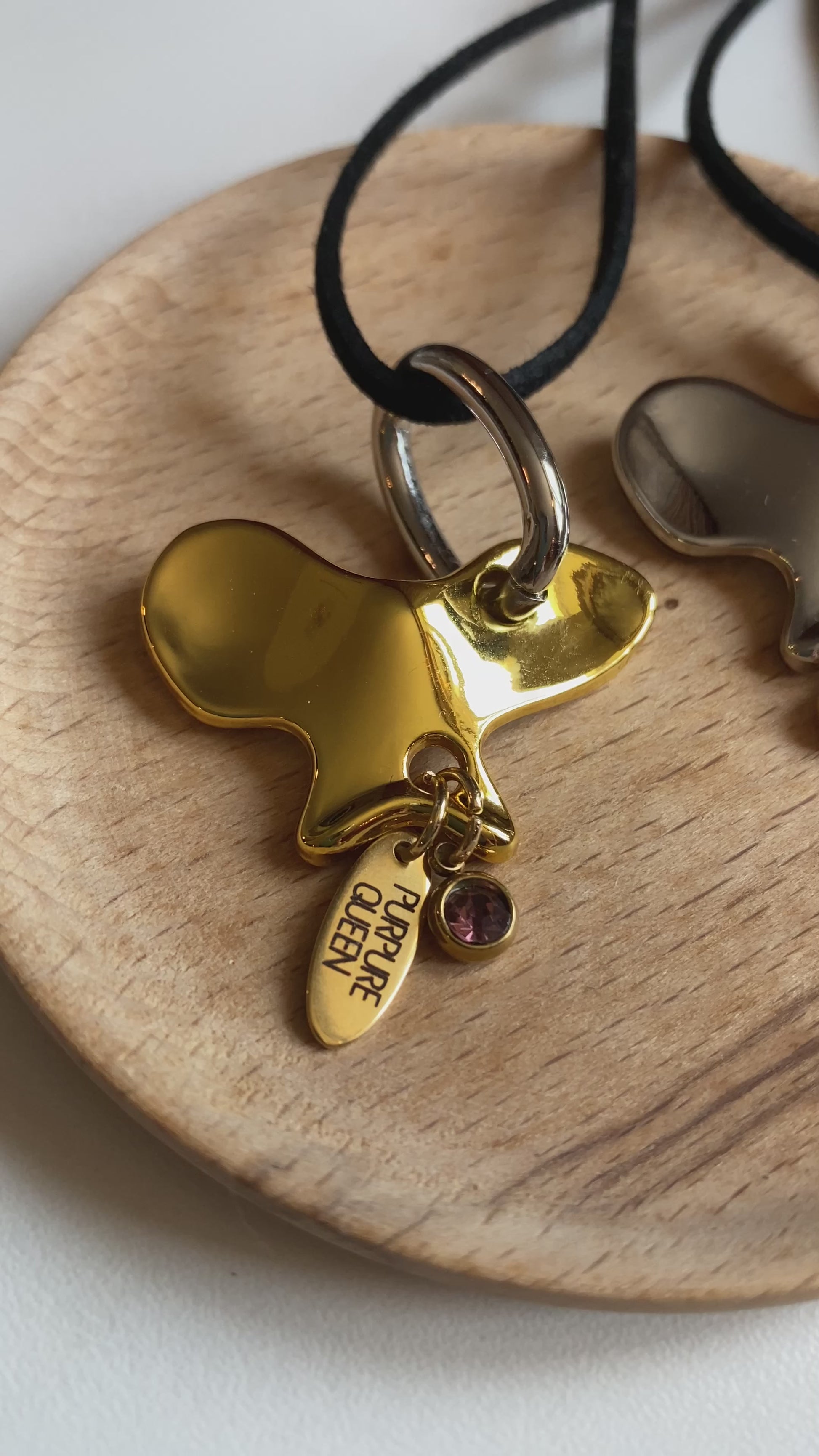 The pendant is made of hypoallergenic metal with a galvanic coating, gold 24k, adorned with a crystal and the brand’s logo.